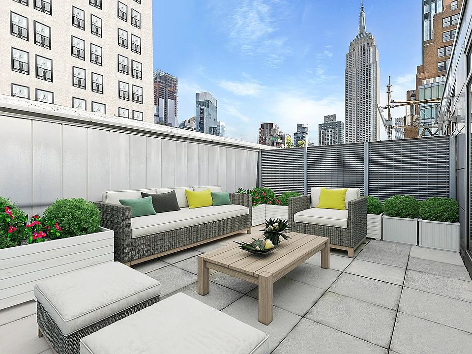 PENTHOUSE DUPLEX WITH HUGE TERRACE1,987 Square Feet of Living (1,706 interior + 281 exterior)MASSIVE PRIVATE STORAGE and W/D in unit. Upon entering this quintessential three-bedroom, three-bathroom Duplex Penthouse, you are swept away by the soaring 11ft ceilings and oversized windows, inviting plenty of light throughout the home. The beautifully appointed Poggenpohl chef's kitchen is perfect for entertaining and fully equipped with a Viking oven and stove, Viking Refrigerator and Bosch dishwasher. Wide plank oak floors lead you to the expansive Living/ Dining Room, and 2 bedrooms with en-suite marble bathrooms. Follow the beautiful stairwell to the upper level with a sundrenched oversized Master bedroom with more than enough room for a sitting area, home office or a beautiful family room, overlooking a 281 sq ft terrace that is large enough to enjoy lounging and dining. Views of the Empire State Building and New York Sky line are the beautiful views to savor from your terrace. This Penthouse is equipped with everything you need, and complete with an abundance of closet space and custom lighting. Just bring your luggage and call It a Home! The Grand Madison prides itself on providing the highest level of service. The luxurious amenities include a fitness room, 24-hour doorman, concierge, in-house dry cleaner and tailor, daily housekeeping service and a full-time superintendent. Downtown's hottest neighborhood is right outside your door. Opportunities for fine dining abound, with Eataly, the Edition Hotel's Clocktower, Eleven Madison Park, The Nomad Hotel's restaurants, the Ace Hotel's Breslin and John Dory Oyster Bar, ABC Kitchen, Upland, and Gramercy Tavern all within blocks. Pet-friendly and convenient to subways, Grand Central, and Penn Station, the Grand Madison is truly a magnificent place to live and enjoy the best of what this city has to offer. Assessment in place $3833 per month till March 2024
