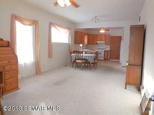 Bungalow with high ceilings & open floor plan. Updated kitchen and bath, 2 bedrooms, and main floor laundry. Front enclosed 3 season porch adds extra space to enjoy in whether it's raining or sunny. Plus a 2 car detached garage.Shingles on home in 2004, steel on garage 2012, perm siding, 100 amp circuit breaker, PVC plumbing, updated doors and windows. Move in ready!
