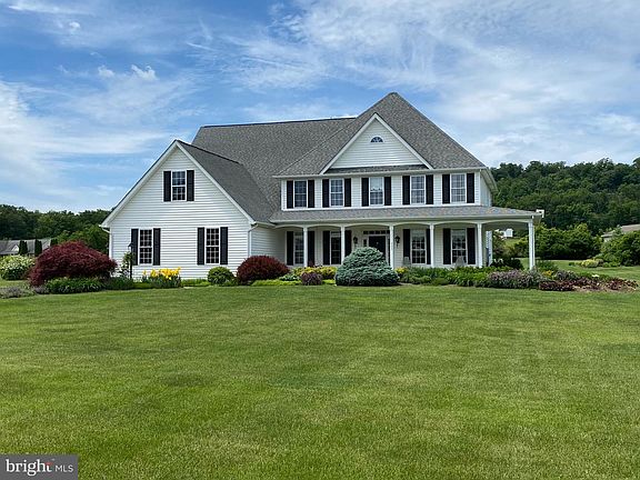 Spectacular Colonial home sitting on 3.1 acres, located in the Apple Pie Ridge Road area. This beautiful home features a large wrap around front porch offering scenic mountain and pastoral views. Dramatic two-story entry foyer with hardwood flooring with inlay wood design. Nine-foot main floor ceilings heights add to the homes Spacious feel. Four bedrooms and 4 full baths including a convenient main floor bedroom. Large primary suite with trayed ceiling, walk-in closet, whirlpool tub, and separate tile shower. The second bedroom upstairs makes a great guest suite having its own private bath and walk-in closet. Bright country kitchen with Cherry Cabinetry, stainless steel appliances, including double ovens. Main level Office / Den. Enormous family room featuring gas fireplace with stone hearth. Formal living and dining rooms. Lots of true hardwood flooring throughout the main level. The home has been meticulously cared for with many recent improvements including, Kitchen Appliances, Carpeting, water heater 2018; Air Conditioning, Basement Furnace 2015, Roof 2011. Three car side load garage and full unfinished basement with plenty of storage.