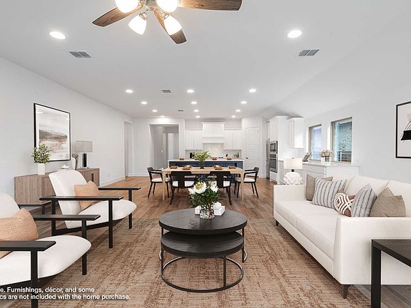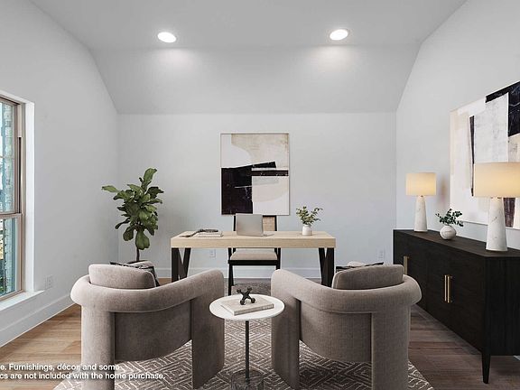 MOVE-IN READY! Home office with French doors set at entry with 12-foot ceiling. Extended entry leads to open kitchen, dining area and family room. Kitchen features corner walk-in pantry, generous counter space and island with built-in seating space. Dining area flows into family room with wall of windows. Primary suite includes double-door entry to primary bath with dual vanities, garden tub, separate glass-enclosed shower and two large walk-in closets. A guest suite with private bath adds to this spacious one-story home. Covered backyard patio. Mud room off two-car garage.