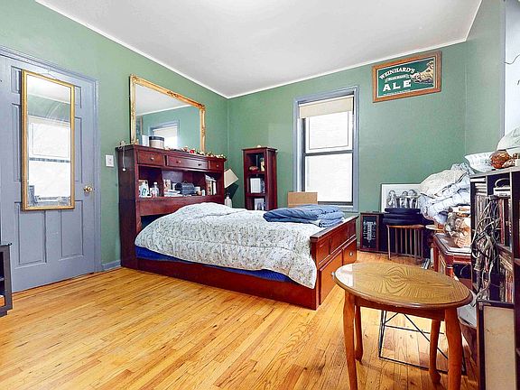 The spacious bedroom offers sunny exposures on two sides including twin windows overlooking the hilly park across the street. There’s plenty of room for bookcases, furniture, a desk, and even a sitting area. It’s emblematic of the apartment itself, just waiting for your creativity and finishing touches. Built in 1940, this pet-friendly building has two elevators, a live-in super, laundry, and new laundry facilities.