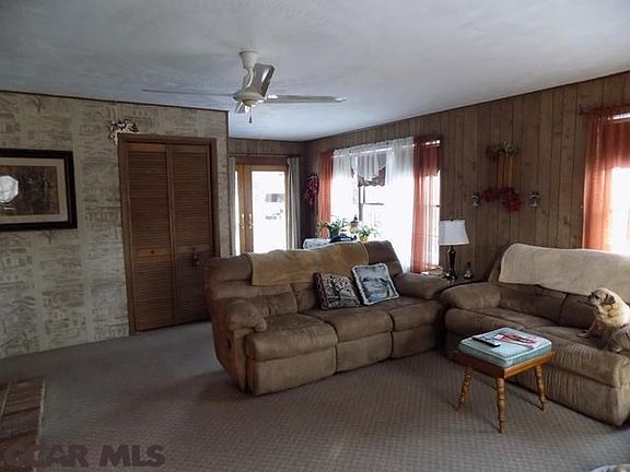 INCREDIBLE VIEWS of Countryside, Mountains and roaming wildlife from this lovely 3 bedroom, 2 bath Ranch home on 2.23 Ac. Bright open-concept living/family room with brick wall, hearth and Harmon Pellet Stove, features large windows to capture the views. Eat-in kitchen offers appliances with new range, plenty of cupboards and countertops. Formal dining room and 3 nice sized bedrooms with hardwood floors. Inviting rear patio through French door offers summertime relaxation area. Detached oversized 2 car garage with workbench, oil furnace & commercial air compressor, plus attached barn/area for raising animals. Features include: 2 Harmon Pellet Stoves, 4 ceiling fans, huge unfinished basement, exterior shed & storage area. Washer and dryer, and basement side by side refrigerator sold "as is". Adjacent 2.4 Acre lot for sale at $77,500. Buyer advised to confirm square footage figures.