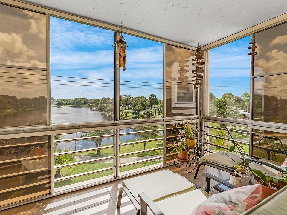 Amazing view in Lakeside Village overlooking Frost Lake with walking/exercise path. Large Primary bedroom with large walk in closet. DEN CAN BE USED AS SPARE BEDROOM OR OFFICE - good size living/dining room. Nice Patio with vinyl windows. newer kitchen with storage -laundry rooms on each floor plus two elevators- community has 2 pools, clubhouse, bocci court, putting golf, exercise room and more - cable and water included in maintenance- building 55 plus community offering transportation to shopping and banking. Public bus line. Shops, less than 4 miles to PBI Airport, downtown WPB, close to beaches, between I95 and Turnpike Great location!