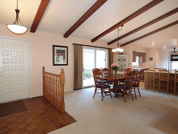 Desirable open floor plan with split bedrooms! The great room features a cathedral ceiling with wood beams, and a wood burning brick fireplace flanked by sliding glass doors leading to the spacious rear deck. The open kitchen features a center island with JennAir cooktop, plus an island breakfast bar. The master suite offers three closets! Two additional bedrooms and bath complete this cozy home nestled on a private corner lot.