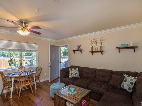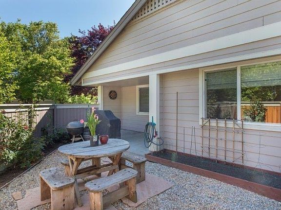 One of the only end units in the complex! The interior benefits from lovely granite counters, generous kitchen storage, a breakfast bar, crown molding and newer hardwood floors and carpeting throughout and 2 full baths. Enjoy privacy with no unit above or under you and a spacious yard that wraps around the unit and offers a covered patio as well as planting beds. Easy parking with a 1 car garage and an assigned spot right in front of the unit.