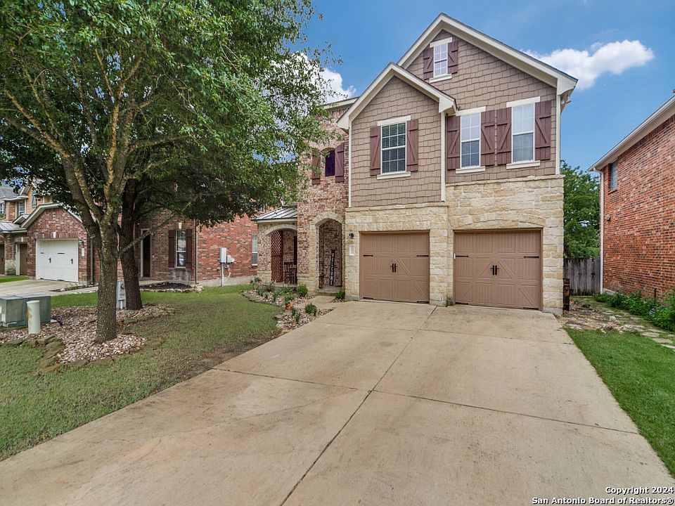 From the beautiful curb appeal, the brick and stone exterior, to the charming front porch you will immediately experience the WOW factor with this gorgeous home. The entry is welcoming and invites you in to the open family room. The kitchen is huge with ample granite counter space, lots of cabinets, touch-activated kitchen sink, and a high end fridge that conveys. A built in china cabinet/buffet is the perfect addition in the dining room and provides additional storage and counter space. New light fixtures in the dining, kitchen, and all bathrooms. An adorable and spacious powder bath is conveniently located downstairs. Upstairs is the very large primary suite with a built in coffee bar with mini fridge. Primary bath has a garden tub, separate shower, and double vanities. 3 additional bedrooms and a secondary bath are upstairs, as well as a loft. The back yard backs to a greenbelt and has a raised bed garden, permanent storage shed, a covered patio and multiple concrete spaces for additional seating, grill, or firepit. This home has great storage throughout, designer touches, and NO carpet! Newly installed roof, water softener, HVAC system, and 6 foot privacy fence. This home is a must see and will be open Saturday, June 15th, 1:00-4:00.