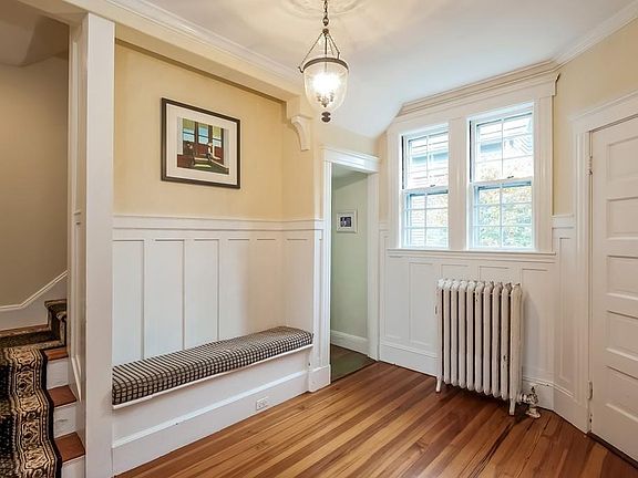 Classic home in highly sought after neighborhood, with yard and driveway on Ruskin Road. Double entry doors lead to generous foyer, highlighted with original bench seating. Spacious kitchen with stainless appliances, gas cooking, corian counter-tops, and separate eating area, open to family room with great light and custom built-ins. Formal dining with fireplace. Half bath on first floor. Rear entrance with mudroom. Second floor offers open foyer with four corner bedrooms, full bath and laundry. Third floor features private master suite, with French doors, walk-in closet and en-suite bath with soaking tub, separate shower, water closet, and double sinks with Carerra marble. Original detail (high ceilings, wainscoting, pocket doors, moldings, 5 panel doors) throughout. Two car garage, patio area, charming front porch, and generous fenced-in yard. Many updates, including new roof (2013) and conversion to gas with new furnace.
