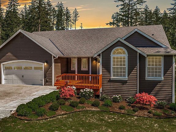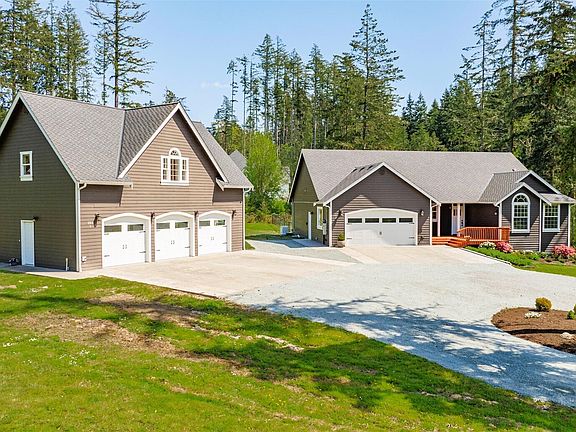 Welcome to peace & tranquility. This stunning N. Camano single-level 3bd, 2.5ba home (1,905sqft) sits in a serene setting. The detached Carriage House (770sqft) feat. a 1 bed, .75 bath living space—perfect for guests, multigen living, or rental income. Inside, soaring vaulted ceilings, SS appliances, peekaboo territorial views & walls of windows that flood both homes w/ natural light. Outside, a dream for hobbyists & adventurers: 3-car detached + 2-car attached garages (epoxy floors & more storage). Room for toys: RV, boat, ATVs. Circular driveway for easy access. 3 expansive patios, fully-fenced yard for pets, a hoop house & fenced, garden beds. Both homes equipped w/ generators & transferable warranties. Pre-inspected for peace of mind.