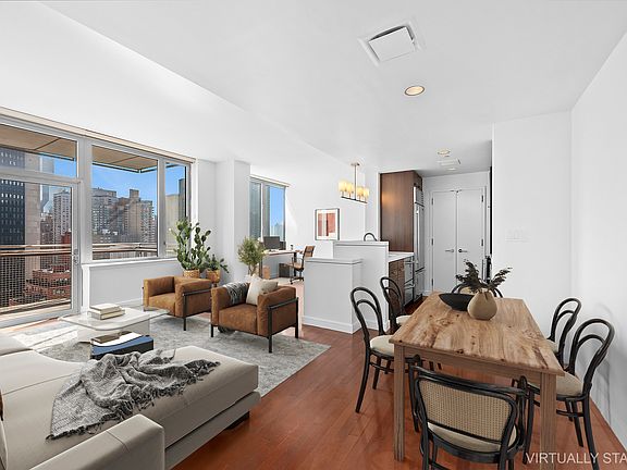 This home features bright clean lines, High Ceilings and Top of the Line Finishes, as well as Yellow Birch Floors, large closets, Central A/C, and Asko WASHER & DRYER units. Floor to Ceiling Double Insulated Windows North Eastern Exposures illuminate your home and boast Incredible City and River Views.
