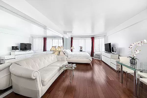 A thoughtfully renovated corner condo graced with penthouse views and vibrant southern and western light, this turn-key 1-bathroom studio offers contemporary Turtle Bay living moments from Grand Central, Bryant Park, and the heart of Midtown Manhattan. This move-in-ready home begins with a welcoming foyer with a trio of reach-in closets and a windowed full bathroom. The studio spans over 20 feet long and can easily accommodate distinct living and sleeping areas. Beautiful hardwood floors run throughout, and a wall of mirrors adds a sense of volume and maximizes natural light. The home also has thru-wall remote-controlled air conditioning and vibrant nighttime city views. Separate from the living and dining area is a windowed galley kitchen adorned with a tiled backsplash, ample cabinetry, a built-in breakfast bar, and full-size appliances including a dishwasher and gas-burning stove. The all-white bathroom features gorgeous tilework and a deep tub with a glass shower partition. The Executive House is a full-service condominium located in Turtle Bay. Residents enjoy very low monthlies, 24-hour door attendants, a live-in super, a shared laundry room, on-site parking, and a private rooftop deck with stunning Midtown skyline views. The building is close to myriad restaurants, bars, cafes, and shops and has close proximity to the United Nations, Grand Central, Bryant Park, and Rockefeller Center. There is a YMCA on the next block, and accessible subway lines include the 4, 5, 6, 7, and the shuttle to the West Side. Pets are welcome. *The home is available furnished or unfurnished.