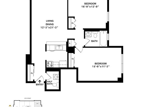 Two-bedroom corner unit with northern views. Features a pass-through kitchen with breakfast bar, plank flooring, and generous closet space.