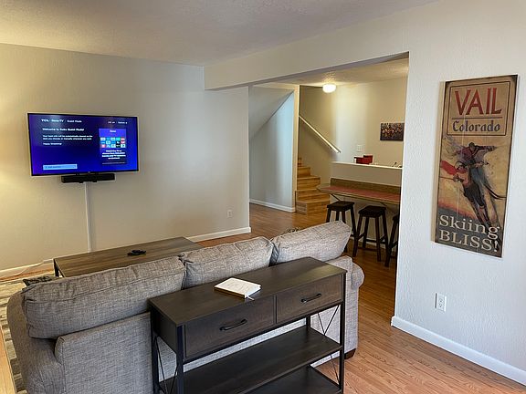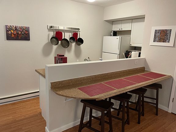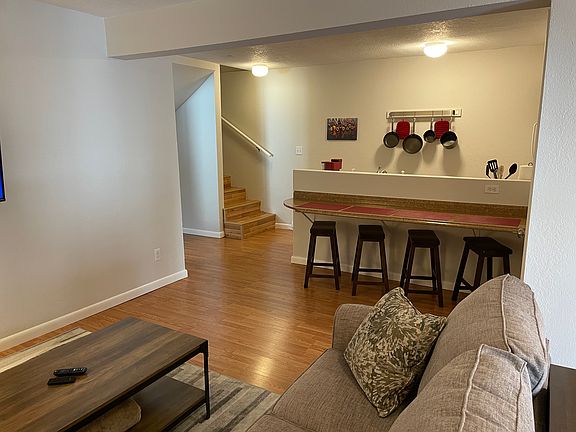 Enjoy easy access to everything upvalley! Fully furnished, the layout of this 1-bedroom condo is highly efficient. The queen bed fits comfortably in the bedroom along with a nightstand and dresser. The living room is comfortable for 2-3 to hang out in the 4 barstools afford ample space for a meal at the built-in dining bar. The kitchen is stocked with all that's needed to cook a simple meal in and features a refrigerator, range/oven and microwave. This condo includes one assigned parking space and is approximately 3/4 of a mile to the EcoTransit bus stop. It is located up two exterior flights of stairs on a simple courtyard. The entire condo is quiped with a small washer/dryer. The stairs shown in the a few of the photos lead only to storage on a landing. While exterior stairs are required to reach the front door, the condo itself is all on one-level. Utilities included. 1st, Last, Security deposit (1-month's rent) required. Lease term negotiable (minimum 3-months, 1-year lease okay) *W/D is compact sized