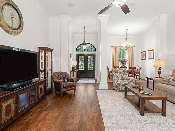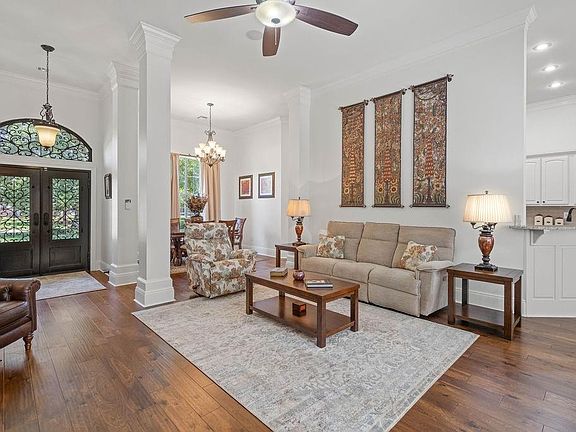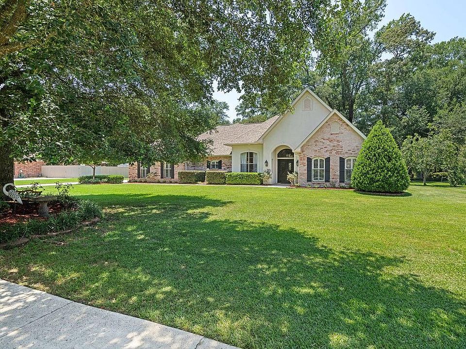 Nestled on a spacious 150 x 200 lot, this property boasts a picturesque park-like setting with 11 beautiful oak trees. Inside, extensive updates completed in 2020 include engineered wood flooring, custom iron doors, modern tiled bathrooms and a kitchen that features new countertops, backsplash and appliances. The primary bathroom updates include a custom tiled shower, freestanding tub, updated countertops and lighting. Brand new water heater. The outside fire pit is perfect for gathering under the beautiful live oaks. This home offers many extras, including rear yard access with a boat pad, a 20kw generator, gutters, 12 x 20 shed with loft and electricity and a polymer coated garage. Dominion Subdivision offers community pool, playground and a beautiful pond entrance.