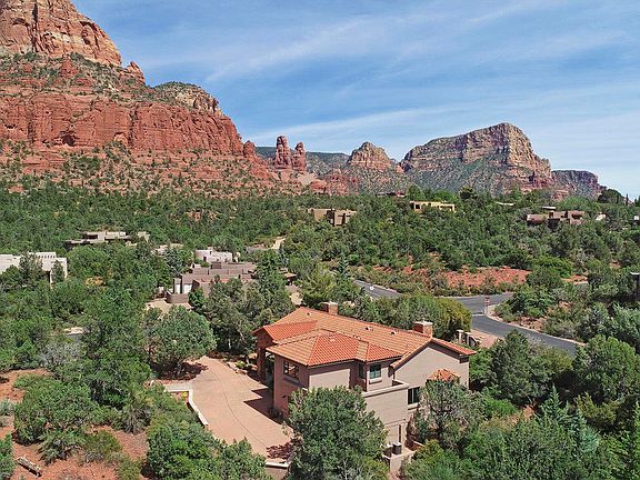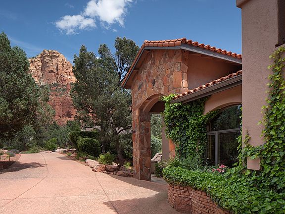 This stunning Mystic Hills residence has blossomed into one of the most delightful & luxurious homes in Sedona. Outside & in, you are embraced by natural splendor & exquisite design finesse & materials that make you linger to absorb the beauty & serenity. The current owners have lovingly renovated & transformed the entire place & made it into a sumptuous, yet comfortable, showpiece that few can match. The patios are extensions of the living room & master suite. They draw you out to enjoy the panoramic spectacle amidst amazing rock work, flowing waters, a fire pit, comfortable furnishings, even a TV & fridge. The organic beauty & light flow back inside with warm, artistic rock finishes throughout. New wood flooring, new appliances, & a whole-house structured water system (see supplement)...