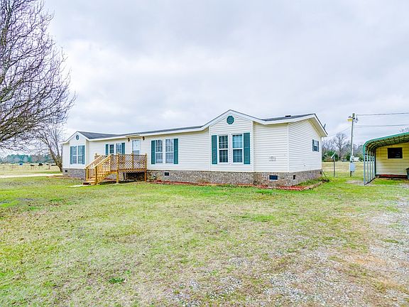 #WellMaintained #CountryLiving This 3 bedroom 2 bath home is sitting on 4 acres of land and has been well maintained. It has a newly installed permanent brick foundation, newly installed front porch (10x8), and newly rolled vinyl in kitchen ,laundry room, and master bathroom. There is a 2 car detached carport and a workshop/shed (18x12) with power. The kitchen has stained wood cabinets, dishwasher, electric cook top stove, and wall oven. There is carpet and vinyl and ceilings fans throughout the home. The master bedroom has a large walk in closet. The master bathroom has a separate stand up shower, garden tub, and dual vanity sink with framed mirror.