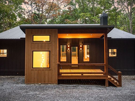 Stunning New Construction Mountain Modern on just over 4 private acres! This home offers the perfect balance of privacy, modern design, and mountain charm. From the welcoming covered porch, step into an open-concept living space with soaring windows and oversized sliders that fill the home with light and capture serene forest views. The great room centers around a sleek modern fireplace with stylish lighting, while the chef's kitchen features a 36-inch gas range, gold accents, a large island, and a spacious walk-in pantry. The dining area, framed by dramatic fixed-glass windows, creates a seamless connection to the outdoors. The main-level primary suite is a private retreat with a custom accent wall, reading sconces, walk-in closet with washer/dryer hookup, and spa-inspired bath with dual vanities and a striking tiled shower. Just outside, a covered porch with a wood-burning fireplace invites you to relax and soak in the peaceful setting. A half bath completes the main level. Downstairs, the terrace level offers even more space to entertain with a cozy gas-log fireplace, wet bar with wine cooler, and storage under the stairs. Two guest bedrooms (one with en suite), a bunk room, and a third full bath with tiled tub surround provide plenty of room for family and friends. The lower-level patio is ideal for a hot tub or outdoor lounge. With usable acreage, and ample parking, this home is as functional as it is stylish. Whether you're looking for a luxury rental investment or a private mountain escape, this property delivers it all.