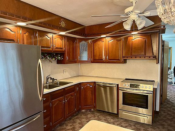 • Kitchen complete with Custom Cherry wood cabinetry and newer stainless steel refrigerator, dishwasher, stove/oven, and under counter microwave oven
