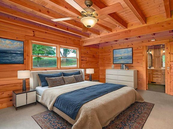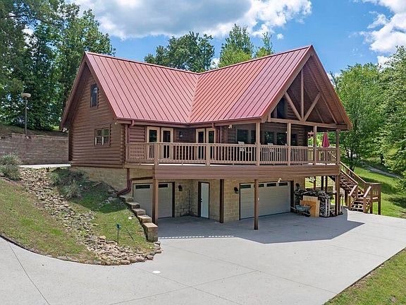 Exquisite Waterfront Log Home on Watts Bar Lake with Year Round Water at Dock and boat ramp!! Discover the perfect combination of rustic charm and modern comfort in this beautiful waterfront log home situated on the serene shores of Watts Bar Lake. This property is designed for relaxing and entertaining, featuring expansive indoor and outdoor spaces. The open-concept kitchen, dining, and living area serves as the heart of the home, boasting soaring beam ceilings and large windows that frame breathtaking views. The stone wood-burning fireplace adds a cozy touch, making it an ideal spot for chilly evenings. On the main level, you'll find the master bedroom with an en-suite bathroom for added privacy. Upstairs, two additional bedrooms each come with their own full bathrooms, and there's a versatile office space currently being used as a fourth bedroom. The lower level encompasses a welcoming den with a kitchenette and a full bathroom, perfect for guests or as an in-law suite. With plenty of parking and storage options, the three-car garage can also double as a recreation room. Enjoy year-round water access with your own private dock, complete with boat lifts and jet ski lifts. Additionally, a private concrete boat ramp provides convenience for launching your boat. Don't miss out on this incredible lakeside retreat!
