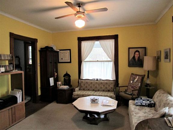 Four Bedroom Farmhouse Style Home with custom woodwork and hardwood flooring throughout. Family Room with brick fireplace, Dining Room which has been used as a bedroom in the past and Living Room with pocket door. Exterior features a wrap around porch for relaxing and entertaining.