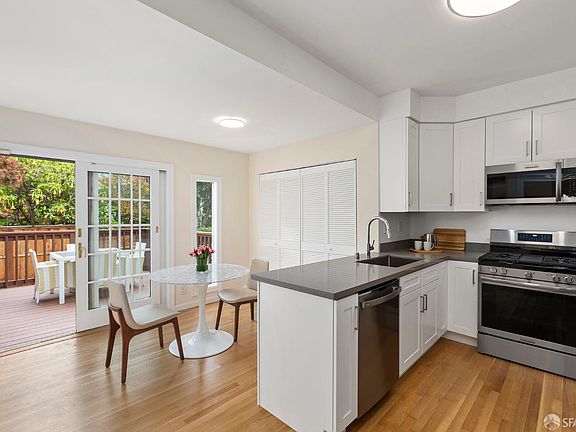 On a prized block in the heart of Bernal Heights, this beautiful Edwardian home is flooded with light from its expansive windows and skylights. The home has been thoughtfully updated for modern living while retaining its charming period details. The newly-remodeled chef's kitchen is handsomely appointed with stainless steel appliances, quartz counters and ample cabinetry. Offering the ultimate in indoor/outdoor living, the kitchen opens onto an expansive walk-out deck for dining under Bernal's sunny skies. The spacious formal dining room is ideal for entertaining. On the upper level, there are two expansive bedrooms boasting hardwood floors and generous closets. These bedrooms are served by a bright, skylit bath with a deep jetted tub. The primary bedroom offers lovely views of the bay and the tranquil garden. An additional bedroom and skylit bath on the entry level are ideal for guests or a nanny. The lush, private garden and flagstone patio offer a tranquil retreat. This lovely home is completed by a convenient laundry, generous garage and abundant storage. You'll love the convenience of being so close to Bernal Heights Park and the shops and restaurants of Cortland Avenue!