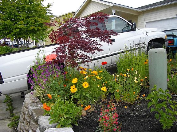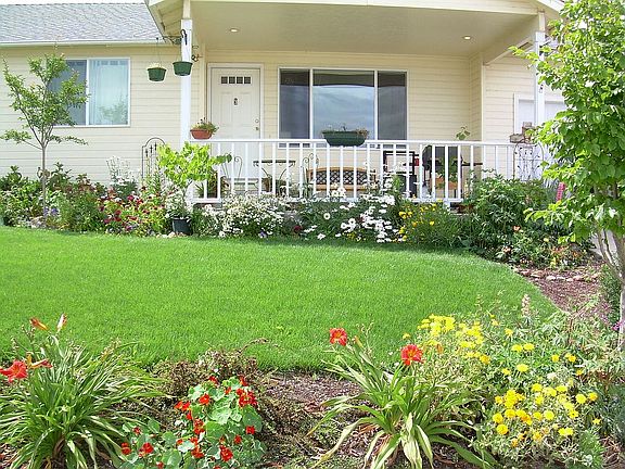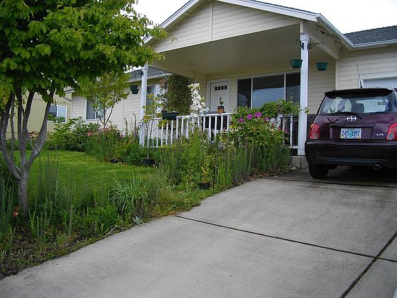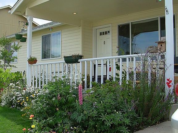 Granite counter tops with granite composite sink, "sea grass" sandstone backsplash with 1 inch square hand made glass insert band, pantry, convection microwave hood combo in kitchen . Hardwood floors and vaulted ceilings in living room/dining room/kitchen--open design. French doors with internal blinds leading to back yard from dining room to 12x16 cedar deck with cedar stairs leading to top of slope. Floor to ceiling shelving and work table in garage. Both baths are full baths. The 3 bedrooms are carpeted. Master has walk-in closet. All windows have blinds -- 1 inch wide slats. Central heating and air conditioning system. 10x17 front porch.
