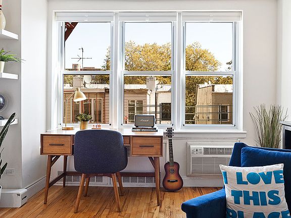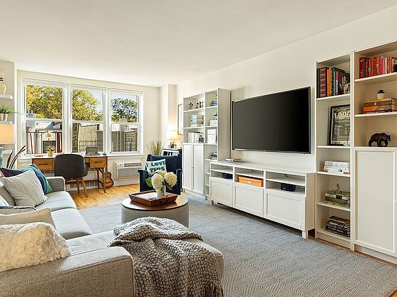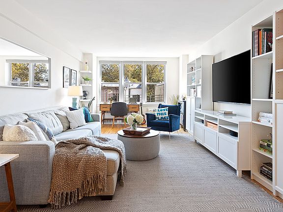 Elegant, sun-filled, and well-proportioned, this lovely 2BR/1BA is nestled on the 3rd floor of a desirable elevator building. This home has undergone a thorough and thoughtful renovation. An entry foyer with a large closet leads to the expansive and inviting living room with ample space for living and dining. A wall of windows peacefully overlook treetops in the rear of the building. The open, windowed chef's kitchen has been tastefully designed with shaker wood cabinets and stainless steel appliances, including a dishwasher, a slide-in gas range with a hood, and a side-by-side refrigerator with ice-maker, granite countertops, a modern subway tile backsplash, and a sizable breakfast counter. The crisp, clean bathroom has also been updated. There is a king-size master bedroom with a wall of windows, a ceiling fan, and a generous closet. A second bedroom with a ceiling fan is situated across the hall. Two additional closets offer ample storage within the living space. Other highlights include refinished hardwood flooring, new windows, in-wall air conditioning, and a video intercom system. Plans are in the works for a furnished common courtyard for residents to enjoy. Positioned in the heart of Kensington along majestic Ocean Parkway, just steps from a multitude of shops and mass transit, the cat-friendly elevator building offers communal laundry facilities, a sleek new lobby, wait-listed parking, storage, on onsite super and porter, and sleek bike storage. The building has recently been wired for Verizon Fios, and solar roof panels powering common areas keep maintenance fees low. Currently zoned for District 15 schools.