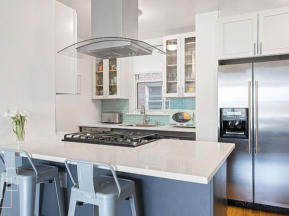 Bright, modern, and well-proportioned, this lovely 2BR/1BA is nestled on a high floor of a desirable elevator building. This home has recently undergone a thorough and thoughtful renovation. An entry foyer with a large closet leads to the expansive and inviting living room with ample space for living and dining, and a wall of windows peacefully overlook treetops in the rear of the building. The open, windowed chef's kitchen has been tastefully redesigned with crisp white upper cabinets and contrasting dark grey lower cabinets, stainless steel appliances, including a dishwasher, a slide-in gas range with professional hood, and a side-by-side refrigerator with ice-maker, quartz countertops, upgraded faucet, a chic turquoise subway tile backsplash, and a breakfast counter. The bathroom has also been newly updated with a vanity and floor-to-ceiling tumbled tiling. There is a king-size master bedroom with a wall of windows, a ceiling fan, and a generous closet. A second bedroom with a ceiling fan is situated across the hall. Two additional closets offer ample storage within the living space. Other highlights include refinished hardwood flooring, new windows, in-wall air conditioning, a video intercom system, and a designer color palette. Positioned in the heart of Kensington along majestic Ocean Parkway, just steps from a multitude of shops and mass transit, the cat-friendly elevator building offers communal laundry facilities, a sleek new lobby, wait-listed parking, storage, on onsite super and porter, and bike storage. The building has recently been wired for Verizon Fios, and solar roof panels powering common areas keep maintenance fees low. Currently zoned for District 15 schools.