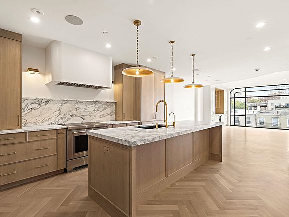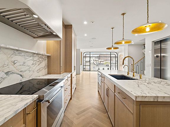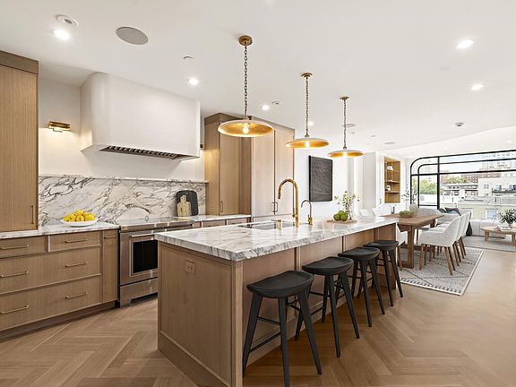 225 Park Avenue is another outstanding new development project by HRG Development. Taking design cues from the historic neighborhood and led by exacting detail and quality craftsmanship, this bespoke ground up new construction 4 bedroom 3 bathroom luxury duplex residence feature large open floor plan with private roof deck, state-of-the-art designer kitchen and bathroom with all the benefits of a newly constructed steel and concrete building with commercial elevator and triple pane windows in a convenient downtown location. The professional Chef’s kitchen features custom white oak cabinetry, large pantry, breakfast/coffee cabinet, and oversized white-oak island. Wolf, Subzero, and Bosch appliances including built-in Subzero refrigerator/freezer with internal water dispenser, 36” Wolf Professional induction range with electric convection oven, Wolf combination speed oven/microwave, Bosch custom panel dishwasher, custom range hood with Wolf Pro liner. Marble kitchen countertops and backsplash; brass kitchen faucet and oversized sink with garbage disposal. The living room features a wet bar with custom painted and white oak cabinetry, brass and glass shelving, bar sink and faucet. Built-in Subzero under-counter wine refrigerator and Subzero under-counter drinks refrigerator and marble countertop. Primary bathrooms with dual white oak vanity, oversize trough sink and storage cabinet, oversized glass-enclosed curb-free shower in Tadelakt plaster finish with linear drain, floating bench, and luxury 3 piece shower comprising overhead rain shower, wall mount showerhead, and hand-held shower, freestanding bathtub with wall mounted faucet, and separate WC with Kohler Innate smart toilet. Second bathroom with dual white oak vanity, soaking tub with shower fixtures, and wall hung Duravit toilet. Third bathroom with single white oak vanity, curb-free shower and wall hung Duravit toilet, Waterworks, Watermark, and Kohler Castia fixtures. Private roof deck with NYC views includes an outdoor kitchen with built-in natural gas BBQ with sink, and refrigerator and private terrace off guest bedroom. Triple pane windows create a virtually airtight, silent interior.