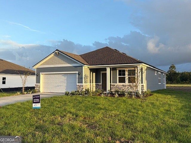 For undeniable style and versatility, choose this brick exterior Champlain plan. Welcome to our Brand New Gated Community...Northshore On The St. Mary's River. This 3 Bed, 2 bath, 2 Car Garage 1786 sq ft One Story Single Family Home on over 1/2 acre (.73 Acres) is ready for an September/October Completion date. This home has it all being on a huge estate lot in a gated community that backs up to a pond. This home has a huge backyard with a large amount of open space back to your pond. Quartz throughout including kitchen, primary bathroom and secondary bathrooms, LVP flooring everywhere except the bedrooms, Shaw carpet in the bedrooms. Kitchen has tiled kitchen backsplash along with tile throughout in the primary bathroom. Whirlpool Stainless steel appliances in Microwave, range/oven, and dishwasher. Interior has a nice office with two French Doors off to the side once you walk into the home. The exterior of this Champlain Floor Plan will have a nice front covered porch with exterior stone as well as a covered rear lanai. Acreage, Acreage, Acreage! Northshore community, having estate size lots, has a community outdoor screened clubhouse, boat access with a dock, playground, basketball court, front and rear gates and is very private and secluded along the St Mary's River. Colors and Options may vary. Contact onsite sales with questions.