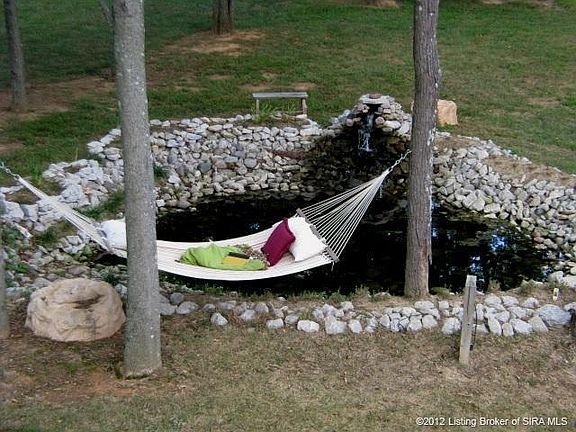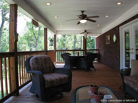 WOW HOME with all of the bells and whistles! Gorgeous All Brick Ranch with Walkout Basement and side entry garage on a 1+ acre park like setting. Natural landscape and 2 ponds complete with waterfall and bridge provides peace and serenity for laid back living. Home is bordered on 2 sides by fields/woods. There are plenty of places to sit outside with a covered front porch, lower level patio, and a HUGE covered back deck (almost feels like a sunroom!) Open floor plan boasts vaulted ceilings, handscraped wood floors, formal dining, and a kitchen island that the entire family can gather around. Sitting room off of living room offers additional living space. Beautiful stone work and 3 fireplaces in home! Master suite walks out to back deck & has a closet and bath to die for! HIDDEN ROOM located in home. Two walk in pantries. Lower level plumbed for a kitchen. This home is every bit of extraordinary!\n\nInformation Deemed Reliable But Not Guaranteed. Information provided by the Southern Indiana REALTORS® Association, Inc. © 2010 SIRA Multiple Listing Service. All rights reserved. Brokered And Advertised By: RE/MAX FIRST Listing Agent: Rebecca Potter