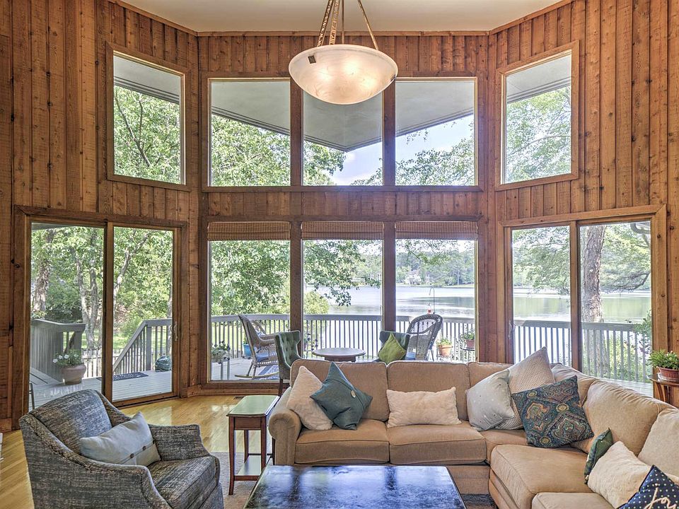 Spectacular water front views framed by cathedral ceilings and floor to ceiling windows throughout this home. Contemporary home wraps around 1.22 acre lot with approx. 300 ft of waterfront. Each room has windows that give big views and privacy at the same time. Great room with a wall of windows facing water and a gorgeous statement masonry fireplace fitted with natural gas logs. Formal living and dining rooms with large windows, and open flow. Loft with built in bookcases. Large kitchen with island, double ovens, refrigerator and eat-in area with floor to ceiling views of water. 4 Bedrooms, 3 full baths, 2 half baths. Huge Master with fresh paint opens onto deck, wall of windows with lake views. Master bedroom and bedroom 4 each with private baths. Hardwoods in common living spaces, new carpet 2020 in bedrooms. Marble tile entry, wet Bar off Great room, dramatic custom lighting in Great room, Kitchen, and baths. Extras throughout that delight! Encapsulated crawl space for completely dry storage, lake fed irrigation for lush yard with landscape lighting. New HVAC master side of home 2018, gutters installed over back deck, deck replaced, fencing installed. Two water heaters and one is brand new! New sprinkler pump. Refrigerator, washer convey with house. This house is move in ready!