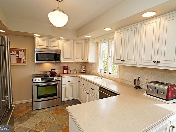Sweet and soothing are words that spring to mind upon entering this modernized mid-century Cape Cod. Set back on its wooded half-acre lot, the three-bedroom, two-bathroom home is in perfect turnkey condition with its tan siding, black shutters and cherry red front door. Inside, you’ll delight in gleaming hardwood floors nearly throughout and walls painted in calming shades of pale blue, gray and cream. An immaculate kitchen at the heart of the home is outfitted with cream-painted cabinets that are lightly distressed, and a suite of stainless steel Jenn Air appliances including a convection oven/flat-top range with downdraft exhaust and a French-door refrigerator with freezer below. Casement windows above the sink and in the adjoining breakfast nook flood the room with light, while double French doors lead from the family room to the spacious deck. In the family room, a woodburning fireplace with gray and white tile surround and mission-style iron doors is flanked by floor-to-ceiling built-in shelves. Spacious enough for cozy armchairs, it’s the perfect place from which to watch the wildlife outside. Two bedrooms on the first level share a remodeled hall bath that features white subway tile on the lower half of the wall, a pedestal sink, sconce lights on either side of the tiltable mirror, wooden plantation shutters and hexagon floor tile. At the front of the home, the living room features wooden plantation shutters and chair rail and crown molding for an understated yet elegant touch. The entire second level is the carpeted master suite, and features a sitting area with built-in shelving at the landing, a bedroom with two walk-in closets, and a bathroom with glass-doored shower and pedestal sink. The spacious unfinished basement houses the laundry area and offers easy access to the backyard via a Bilco door. Closets throughout the home provide ample storage. An attached garage for one car completes the picture, with additional parking in a cutaway near the front of the property. Location wise, this home ticks a lot of items off the list. It’s near major highways for commuters, five minutes from downtown Pennington, and 20 minutes from Princeton. The road is quiet and a bit winding, which adds to the feeling of a country retreat at the end of your drive. And, for lovers of the outdoors, there are ample preserved open spaces nearby, plus Washington Crossing State Park, which attracts enthusiasts to its trails year-round.