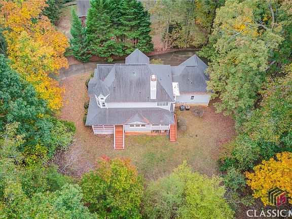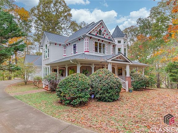 Victorian charm meets country charm! Situated on over 2 acres with no HOA, this home offers the peace and tranquility you have been searching for but couldn't find! The large, sweeping front porch is perfect for your rocking chairs, a cool drink and listening to Mother Nature. Once inside, the gorgeous hardwood floors and decorative moldings throughout the home executed excellence and sophistication. A convenient home office is located just inside the 2-story foyer, while a large, formal dining room featuring French doors that lead out to the covered porch provides a lovely atmosphere when entertaining. Your formal fireside living room is great for relaxing, while the spacious eat-in kitchen is kept cozy by its own fireplace! From the kitchen you will have access to a wonderful sunroom, perfect for the cooler months. The lower level is also home to a convenient half bath, laundry/mudroom combination and access to the large garage area. Upstairs you will be greeted on the landing with a perfect spot for cozying up with a good book from the built-in bookshelves and enjoying the wooded view with a cup of coffee. The Owner's suite is adorable, highlighted by the soaring windows in the home's unique "touret." The large en suite bathroom featuring a double vanity, shower and soaking tub are again highlighted by the serene wooded views from all of the windows. Two more additional guest bedrooms, each with thier own guest bathroom round out the second floor living area. Additionally, one of the guest rooms offers a private balcony for guests to unwind and enjoy the view. There is additional BONUS room and another bathroom which is currently being used as another bedroom, but could easily be your craft room, storage or another home office space that has access from the mudroom area via a seperate staircase. The covered back deck area overlooks your expansive, wooded backyard and offers a peaceful respite from the busyness of life! Near all of Hoschton's local amenities, yet tucked away from the hustle and bustle, this home offers a unique opportunity for the discerning homeowner.