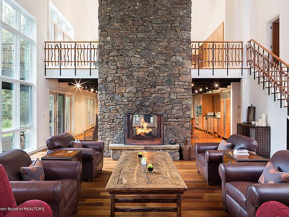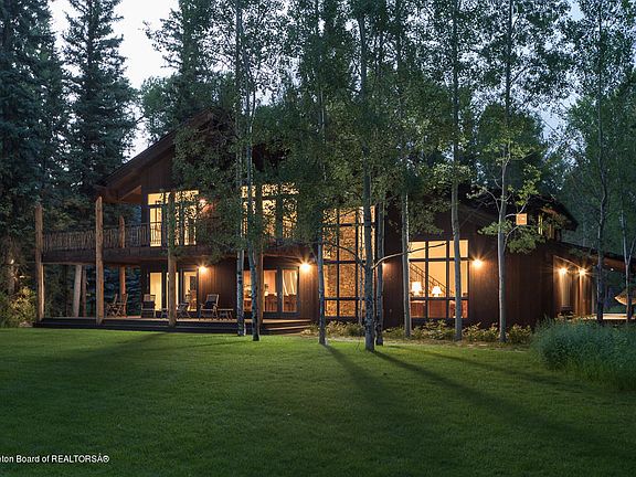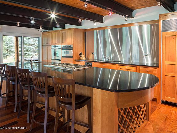 This impressive home has an exquisitely comfortable floor plan and impeccable details throughout. Designed by Steven Dynia,this gracious mountain modern home is surrounded by mature trees, and it is one of Jackson's finest offerings. The extremely private property is on a total of 5 acres and includes a stream, pond, and wildlife haven. The great room features a floor to ceiling Montana Moss Rock pass through fireplace and Brazilian Walnut hardwood floors.