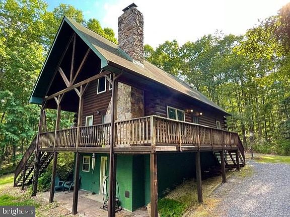 Located 30 mins outside of Winchester, VA, this beautiful log cabin provides a commutable get-a-way from the rush of city life. Privacy abounds on your 5.23 wooded acres. The large wrap around porch provides a beautiful year round view on top of the ridge. Your cabin is 7 mins down a lovely, meandering, well maintained, gravel road. The only sounds you'll hear are the birds as you sip coffee on the deck while watching the sunrise. Keep a watchful eye out for the amazing 3' tall King Woodpecker who lives in the surrounding woods and deer walking peacefully through the property. Inside, you'll find vaulted ceilings throughout. There is a well equipped kitchen and open floor plan. The beautiful stone fireplace, built using local stone, will glow with warmth during the winter months. A full, dry, walk-out basement with wood stove and rough-in for bathroom, is ready for your finishing touches. On the main floor you will find the master bedroom and bath. The second floor has a balcony with nook for reading or relaxing where you can take in the view. The second bedroom has vaulted ceilings with large skylight and plenty of room for the kids or guests to your secluded get-a-way, along with bathroom and Jacuzzi tub. Take the time to view the large photo album of the home being built by a log cabin builder. Get your toothbrush ready and see this home soon. It won't last long.