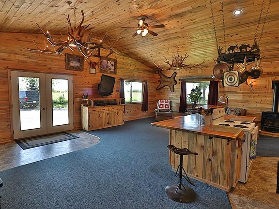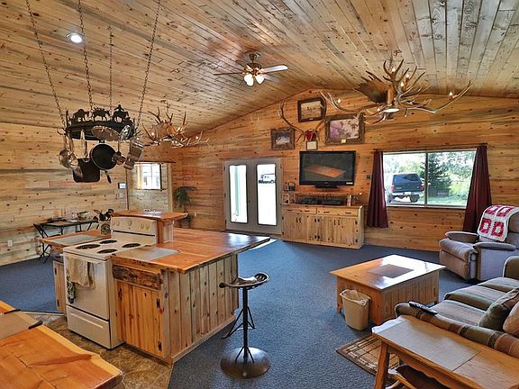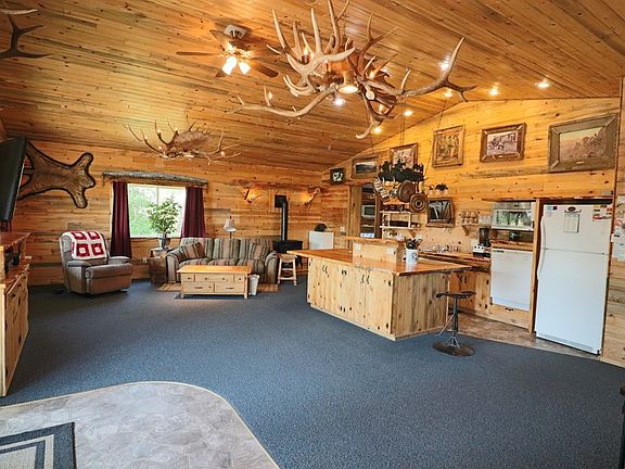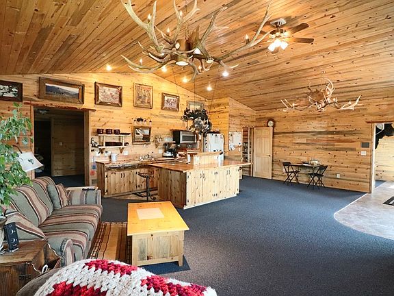 Nestled among mature trees, this home has a warm & inviting atmosphere as you enter into the spacious great room with vaulted ceilings, elk antler chandeliers and tongue and groove knotty pine ceilings and walls. Custom knotty pine cabinets with log accents gives a feeling of western ambience. Beautiful yard w/2 garden areas, several outbuildings,50x100 corral. 18.43 ac. net & 4.5 ac. irrigated.