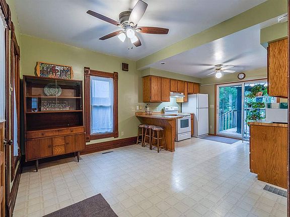 Updated while keep its original charm, this 1 1/2 story home is energy efficient & conveniently located - walking distance to downtown, schools and parks. Featuring 3 bedrooms, 1 1/2 baths, the inviting open concept kitchen & dining area with breakfast bar has sliding glass doors to the large deck with gazebo, overlooking the fenced, park-like backyard. Cozy living room with Franklin gas stove, beautiful woodwork, high ceilings, great natural light & main floor laundry. Upstairs you'll find 3 bedrooms and updated, full bath. Covered porch & enclosed porch, 1-car detached garage, new concrete drive, storage shed Take a look before it's gone!