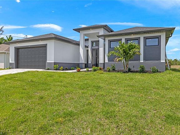 Welcome to your dream waterfront retreat in highly sought-after SW Cape Coral! This stunning NEW CONSTRUCTION home boasts 3 bedrooms and 2 bathrooms, nestled on a serene freshwater canal, offering access to endless outdoor adventures right from your backyard. NOT IN A FLOOD ZONE and NO HOA fees, make this an ideal opportunity for a primary home, a second home escape, or a savvy investment property. Impact windows and doors give added peace of mind. Step inside to discover a contemporary oasis adorned with luxurious touches throughout. The spacious layout features beautiful oversized tile flooring, complemented by elegant tray ceilings, and exquisite quartz countertops in the kitchen and bathrooms. Entertain with ease in the expansive living area or take the gathering outdoors to the oversized lanai, complete with a picture window pool cage framing the sparkling saltwater pool. Whether it's enjoying a refreshing dip or simply soaking in the Florida sunshine, this outdoor space is your private paradise. Retreat to the primary suite, where indulgence awaits in the spa-like bath boasting a walkthrough shower, double sinks, and dual large closets, ensuring ample storage and comfort for every day. Experience the epitome of waterfront living and embark on a lifestyle of luxury, leisure, and relaxation in this exceptional Cape Coral residence. Schedule your showing today and make this waterfront haven yours!
