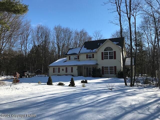 STAY AND PLAY ! This Center hall colonial nestled on almost 2 acres in Pocono mountains features generous open floorplan with many entertainment areas 4 bedrooms , 3 baths , home office/music room , 2 car garage , large deck and pool with attached deck and cabana