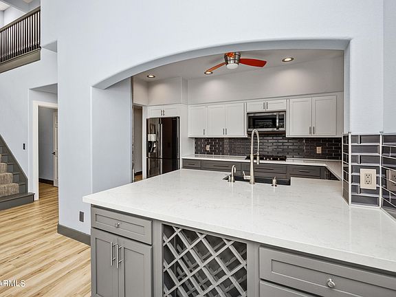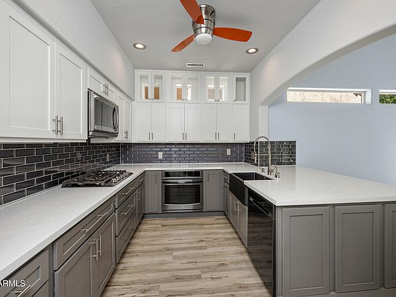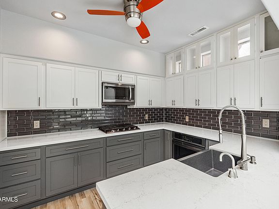 Where in AZ can you find a contemporary updated home near a creek in a lushly landscaped gated community within walking distance to stores & have gardeners take care of the front yard? It's rare & it's right here. Owner of this 2Bed+Den has made luxury upscale stylish improvements with comfort & pleasure in mind such as-new cabinets, flooring, heated bath floor in upper suite, dual shower, glamour closet, backsplash, highend Pella sliding doors with between the glass blackout blinds, new decking, rails & awning, top notch fireplace insert, shuttered windows. Watch sports or movies in your own media room. Or just sit outside enjoying the sounds of the creek. Side yard for fido or walk on nearby trails. HOA covers landscaping making this your perfect get-a-way or full time home.