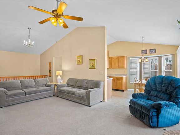 Bring your decorating ideas - here's a place to make your own! This VAULTED OPEN PLAN detached villa has a WALKOUT LOWER LEVEL and is ready for your paint & flooring choices. Short walk to community POOL & clubhouse! 10 minutes to shopping on Wentzville Parkway. Traditional brick/vinyl exterior with charming COVERED PORCH. RELAX EVERY WEEKEND - lawn, landscaping & snow maintained by association. SOARING GREAT ROOM with brick fireplace (curved hearth), open to breakfast room. HUGE BAY WINDOW for wonderful natural light, plus sliding door to 10-ft deck - ideal for entertaining. Well-planned kitchen with wood cabinets, white appliances (gas cooking), window over sink. Convenient main floor laundry room. MASTER SUITE features dual windows, bath with step-in shower, WALK-IN CLOSET. Bright bay window in 2nd bedroom. Breezy ceiling fans throughout. Open staircase to spacious lower level with tons of STORAGE, plus egress window & rough-in bath for easy future finish. Sliding door to patio.