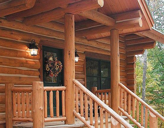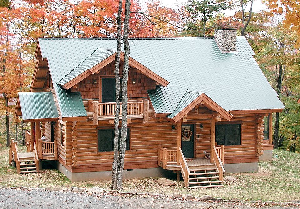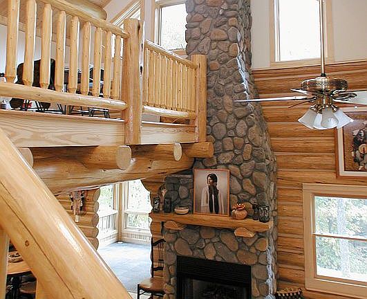 Hand hewn log home with open floor plan. Additional sunroom and large loft with a library wall. Balcony off master on second floor. Living area has a stone gas fireplace with chimney extending through roof.