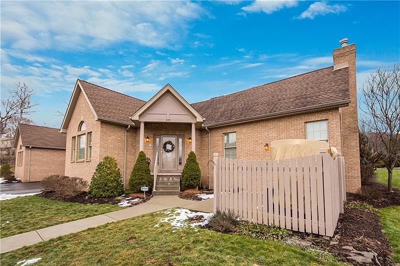 Beautifully updated patio home offering a care free lifestyle in a sidewalk community w/unbeatable access to Route 19 and I-79. This spacious home offers all you need for everyday living on the main lvl. A tiled entry flows into the home's 2 open living areas. To the left of the entry is a combo liv/din w/scraped engineered wd flr, vaulted ceiling, and fresh neutral tones complimented w/white trim. The din area opens into the gourmet KIT w/ivory cabinets, granite counters, tiled backsplash, and SS apps. The laundry attaches to the KIT and provides access to an oversized 2 car grg w/plentiful storage. A .5 ba is next to KIT. To the right of the entry is the famrm w/gas FP flanked w/tall windows and new plush ww. Also on the main lvl is the owner's retreat w/en-suite tiled ba featuring a step-in shower and dbl vanity. A back staircase leads to upper lvl w/2 additional bdrms, full ba, den, and great storage! A patio at the front of the home w/privacy fencing is the perfect place to relax.