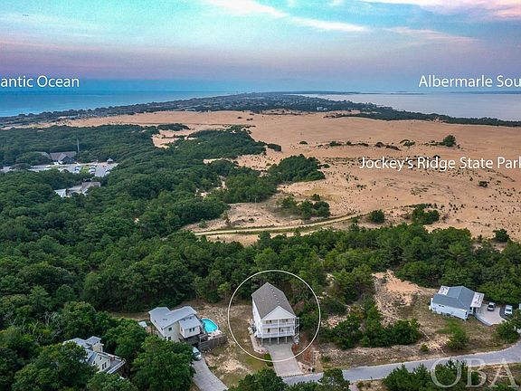 Located on the edge of Jockey's Ridge Nature Preserve, you will find this spacious home featuring three levels of living, each serviced by it's own Heat Pump, four exceptionally large Ensuite Bedrooms each offering access to breezy covered decks with dune views of the park property! The main living space is located mid-level and features a lovely Great Room with cathedral ceiling and wood laminate flooring, open Dining space, a large Kitchen with stainless appliances, Laundry Room, Powder Bath and the Primary Ensuite Bedroom. Make your way up to the top level and you will find a large open hall offering access to each of the three Ensuite Bedrooms with deck access. The ground level Game Room is a HUGE space to enjoy gaming and movies and features a Wet Bar, 2nd Refrigerator and Full Bath! Add a pool table for additional fun or separate this space and convert to a secondary living area with separate entrance! Features such as the exterior cargo lift (lifts up to 1000 lbs.), Attic with drop down stairs, ample closets, exterior Storage Room and tons of parking make this home the perfect choice for year round living, your second home at the beach or investment property. The multi level composite decks and vinyl railings make for low maintenance living! At the time of construction a proposed 17.5 x 9.5 pool was included - see survey in Associated Documents. Location, condition and spacious! Check this one out today!