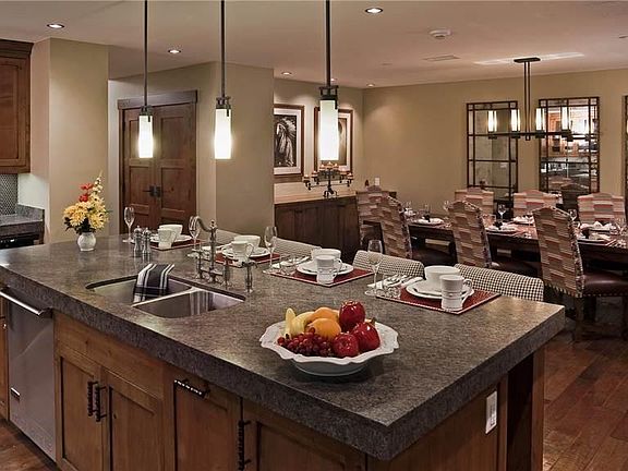 This fourth floor residence is luxury at it's highest level, featuring two floors with master on the main and the other bedrooms upstairs along with family room/media area. OSP has the best most coveted location at the base of the Steamboat ski resort with access to an amazing array of activities. Ownership at OSP offers an array of amenities that simply is not available at any other property in the Steamboat area. Spa, pool, hot tub, social area, meeting room, special children's area, ski and boot locker room with ski valet service, and shuttle system to help you move around the community. This unit is designed to be enjoyed by the entire family or can be used for a corporate retreat and with the spacious living area, kitchen and dining room plenty of room for all. People that have been in this unit say if not the best, certainly one of the best designed units in the complex. The kitchen features a large stone island with a pass through to the living area.