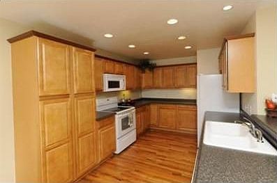 Refreshed and updated kitchen, hardwood floors refinished, new countertops and cabinets. New tile floor in main level. Powder room and five piece master bath. Remodeled basement. Very clean and bright. Large deck. Beautiful spruce tree in back yard. Very close to open space.