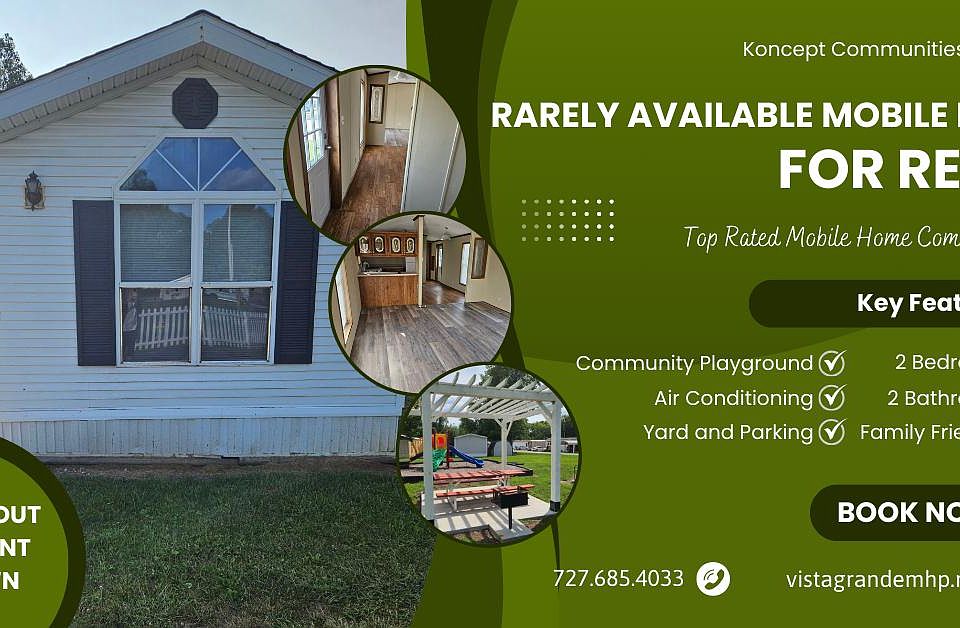 Freshly painted with brand new flooring installed. Rarely available home in a family friendly, top rated mobile home community. This home features everything you need, central air conditioning, dishwasher and in suite hook ups for washer and dryer. Parking right outside your house and your own yard for the family to enjoy. Bonus there is a community playground and bbq area for the family right outside your front door! Rent includes pad rental. Tenant is responsible for paying their own utilities, water/sewer, gas and electricity.