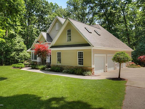 Rare opportunity in Ada Township! Better than new with mature landscaping and tasteful updates in an established gated community across the street from Egypt Valley Country Club, one of the area's most beautiful and prestigious courses. Transitional decor features custom built-ins, custom window treatments, granite countertops, stainless appliances, Generac generator, new furnace, AC and water heater. Main floor master, 2-story foyer/great room, formal dining space and den! Upper level bonusroom, two additional bedrooms, full bath and loft. Walkout lower level for future living space. 4 car outbuilding (1432 sf on the main with 712 sf above) with car lift is sure to delight the hobby mechanic, car collector, winter sports enthusiast looking for a place to store snowmobiles, or house full of teen drivers who also get their own garage space! Impressive 12x32 ft deck above walkout provides a summer sanctuary on this very private 1.7 acre wooded lot. A great place to call home!