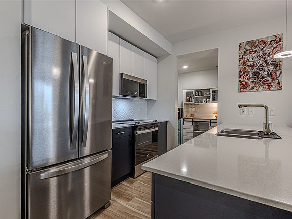 Walking distance to new park space and a paved creek feature walkway that travels through Majoros park up to shopping and amenities. Also easily walkable to the Gellatly Bay - providing an aquatic park, dog park, dock, marina, beaches and a 2km lakeside walking trail. 302 is a corner unit with views of Majoros park greenery, more privacy and an additional window with no parking lot view! Upgraded soundproof flooring and ceilings with 18cm gypcrete for comfort. Functional split bedroom, high ceilings making the space feel bright and large. Kitchen contains custom 2 tone cabinets with chevron tiling backsplash and oversized island - great for hosting! Entire unit has new vinyl flooring, lighting upgrades, shower upgrades and a walk-in-closet. Unit comes with an underground parking stall and brand new appliances.