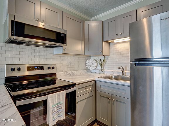 Don't miss your chance at owning an oceanfront condo in the community of Topsail Reef! This 1 bedroom, 1 bath unit was completely remodeled in 2021/2022 and has so much to offer. The kitchen includes Whirlpool stainless steel appliances with a built-in microwave and the bathroom is fully updated as well. Needing space for guests to sleep? The hallway bunk beds are perfectly tucked away and very cozy. Enjoy the mini split heat pump and like-new furniture throughout the entire condo. The current owners have enhanced the unit even more by adding subway tile back splash, screen for sliding glass door, and modular composite deck tiles. Did I mention the brand new Adirondack chairs and bistro table on the balcony? It's the best spot to take in the all the gorgeous beach views. Topsail Reef HOA covers the cable, internet, water, sewer, and trash. Amenities include a laundry facility, recreational courts, grilling, and picnic areas. With the sellers' upcoming move across the country, all of this could be yours!